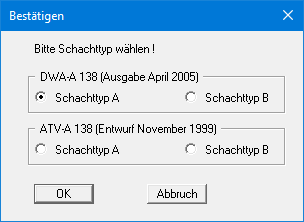 Die Vorgehensweise wird am Beispiel im Arbeitsblatt (Anhang A.2.5) gezeigt. Wählen Sie den Menüeintrag "Datei / Neu" oder den Menüeintrag "Bearbeiten / Versickerungstyp". Da nach DWA-A 138 mit den Regenspenden-Tabellen aus dem KOSTRA-Atlas gerechnet wird, ist der Schalter "DWA-A 138 (empfohlen)" aktiviert. Geben Sie als Zuschlagsfaktor 1.2 ein, falls dieser nicht schon so vorgegeben ist. Verlassen Sie die Dialogbox durch Klicken auf den Knopf "Schachtversickerung" und wählen Sie Schachttyp A gemäß DWA-A 138 (Ausgabe April 2005).