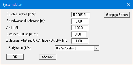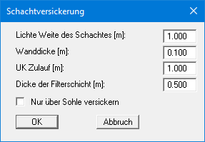 Bestätigen Sie Ihre Eingaben mit "OK". Wählen Sie anschließend den Menüeintrag "Bearbeiten / Schachtversickerung (Typ A)" und geben Sie die Werte der folgenden Dialogbox ein.