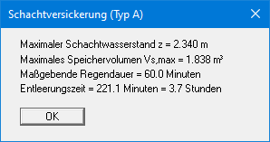Jetzt können Sie die Schachtversickerung berechnen. Wählen Sie dazu den Menüeintrag "System / berechnen". Sie erhalten das Ergebnis der Berechnung: