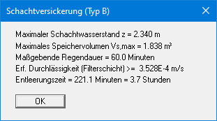 Jetzt können Sie die Schachtversickerung berechnen. Wählen Sie dazu den Menüeintrag "System / berechnen". Sie erhalten das Ergebnis der Berechnung: