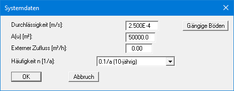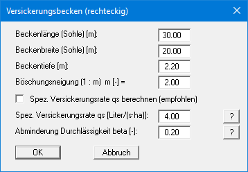 Bestätigen Sie Ihre Eingaben mit "OK". Wählen Sie anschließend den Menüeintrag "Bearbeiten / Versickerungsbecken" und geben Sie in der Dialogbox die Daten für das Versickerungsbecken ein.