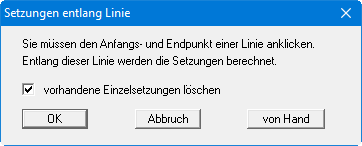 Wenn Sie die Box mit "OK" verlassen, legen Sie die Linie durch Anklicken von zwei Punkten mit der linken Maustaste fest und geben anschließend die Anzahl der Unterteilungen ein. Entsprechend dieser Anzahl werden die Setzungen auf der Linie berechnet. Sie haben aber auch die Möglichkeit, die beiden Linienendpunkte über die Eingabe der Koordinaten zu definieren. Klicken Sie dazu auf den Knopf "von Hand". Hatten Sie bereits Einzelsetzungen berechnet, erscheint der oben dargestellte Schalter. Wenn Sie die bereits berechneten Einzelsetzungen übernehmen möchten, deaktivieren Sie den Schalter.