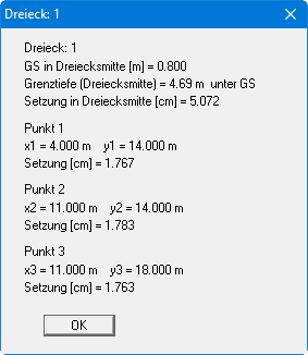 Über diesen Menüeintrag können Sie die Ergebnisse der Setzungsberechnung für ausgewählte Dreiecksfundamente in einer Infobox ansehen. Haben Sie das System noch nicht berechnet, werden in der Infobox nur die Punktkoordinaten des Dreieckfundamentes und die Gründungssohle dargestellt. Nach Klicken mit der Maus auf ein berechnetes Dreiecksfundament erhalten Sie beispielsweise die folgenden Ergebnisse: