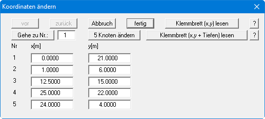 Alternativ zur Eingabe der Koordinaten mit der Maus können Sie auch die Werte in Tabellenform eingeben. Wählen Sie dazu den Menüeintrag "Netz / (Knoten) ändern" und ändern Sie die Anzahl der Punkte über den Knopf "x Knoten ändern" auf "5".
