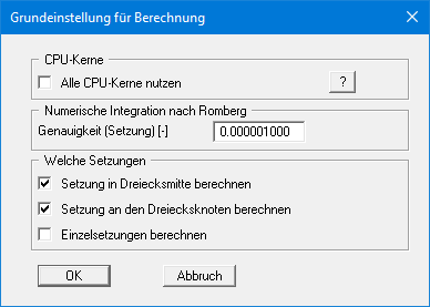 Bei der Berechnung von Dreiecksfundamenten ist eine numerische Integration erforderlich. Die Genauigkeit der Integration können Sie im oberen Teil der Dialogbox einstellen. Der vorgegebene Wert ist für die meisten Problemstellungen hinreichend klein. Wenn Ihnen die berechneten Ergebnisse allerdings sonderbar erscheinen oder wenn Sie von Natur aus vorsichtig sind, geben Sie hier einen kleineren Wert vor. Das geht allerdings auf Kosten der Rechenzeit.
