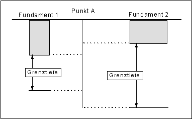 Bei der Berechnung von Setzungen werden nur die Spannungen von der Gründungssohle des Fundaments bis zu dessen Grenztiefe berücksichtigt. Somit gilt auch für alle Punkte außerhalb des betreffenden Fundaments die Grenztiefe dieses Fundaments. Die Abbildung 3 zeigt in einem Vertikalschnitt, aus welchen Bereichen sich die Setzungen eines Punktes A zusammensetzen, wenn zwei Fundamente definiert sind.