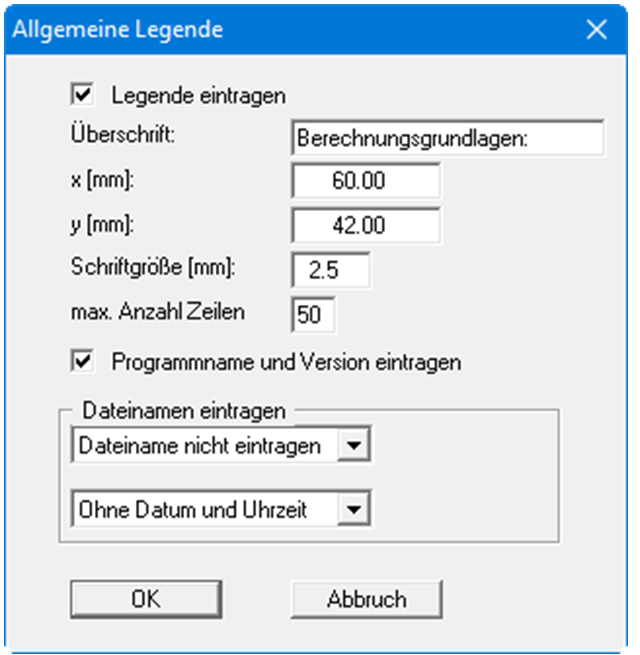 In der Allgemeinen Legende können, wenn gewünscht, Informationen zum Programm (Name und Version) und zur aktuellen Datei (Name, Pfad, Datum, Uhrzeit) mit dargestellt werden. Wenn Sie eine Datensatzbezeichnung eingegeben haben, wird diese ebenfalls in der Allgemeinen Legende dargestellt.