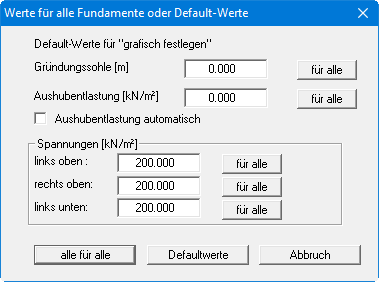 Hinter jedem der Eingabefelder befindet sich ein Knopf "für alle". Die Betätigung des entsprechenden Knopfes übernimmt den aktuell eingegebenen Wert für alle Fundamente. Sie kommen anschließend wieder in die obige Dialogbox und können einen anderen Wert bearbeiten oder die Box über "Abbruch" verlassen. Der Knopf "alle für alle" übernimmt alle Werte für alle Fundamente. Nach Klicken auf diesen Knopf wird die Dialogbox automatisch geschlossen.