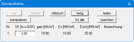 Wenn Sie unter dem Menüeintrag "Böden / Schichten" drei Schichten eingegeben haben, werden in dieser Dialogbox ebenfalls drei Schichttiefen angezeigt. Die zugehörigen Steifemodule sind als Information ebenfalls aufgeführt. Die angegebenen Tiefen können Sie nach eigenen Wünschen ändern. Die Tiefen werden nach unten positiv in m unter OK Gelände (= 0,0 m) eingegeben. Wenn Sie im Menüeintrag "System / OK Gelände" die Verwendung absoluter Höhen aktiviert haben, geben Sie hier die Tiefen in absoluten Höhen ein, beispielsweise in mNHN.