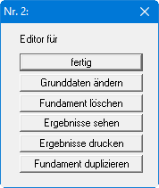Nach Klicken auf den Knopf "Grunddaten ändern" können Sie die Werte für das zweite Fundament gemäß Tabelle 4 ändern. Die Erläuterungen zu den anderen Knöpfen finden Sie im Abschnitt Menüeintrag "definieren".