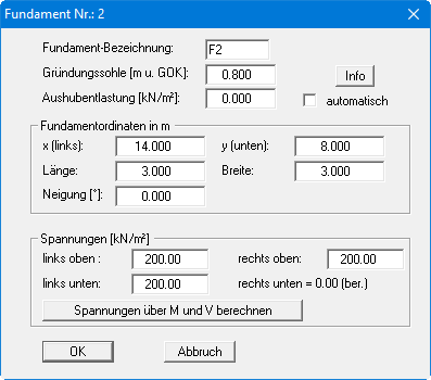 Nach der Fundamentbezeichnung geben Sie die Tiefe der Gründungssohle, die Aushubentlastung, die Fundamentabmessungen sowie die Eckspannungen ein. Bei einer linearen Spannungsverteilung reicht dazu die Eingabe von drei Spannungswerten. Der vierte Wert ergibt sich dann automatisch. Wenn Fundamente bereits definiert sind, erreichen Sie diese Dialogbox auch durch Doppelklick in die Umrandung des Fundaments auf dem Bildschirm.
