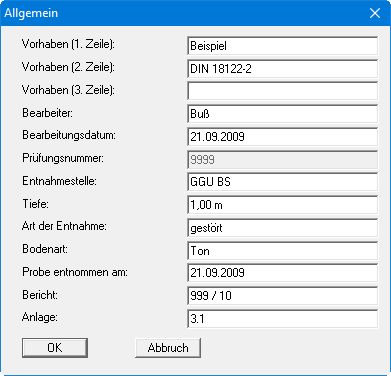Nach Anwahl dieses Menüeintrags können Sie allgemeine Daten wie Bezeichnung des Vorhabens, Berichtnummer, Anlagennummer, usw. eingeben. Diese Daten werden in den dafür vorgesehenen Elementen des Ausgabeblattes dargestellt.