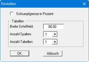 Durch Aktivieren des Schalters können Sie einstellen, ob die berechnete Schrumpfgrenze in Prozent (z.B. 14,20 %) oder absolut (z.B. 0,142) ausgegeben wird. Wenn Sie die Einstellung verändern, müssen Sie darauf achten, dass Sie auch die Beschriftung in der Ergebnistabelle entsprechend anpassen (Menüeintrag "Formblatt / Tabellentexte + Zuordnung").