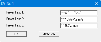 In den Freien Texten können Sie Eingaben mit hoch- oder tiefgestellten Zahlen oder Buchstaben durch die nachfolgend beschriebene Schreibweise erreichen. Am Anfang des Textes geben Sie zwei "~~"-Zeichen ein. Mit den Schrägstrich-Kombinationen "\h" bzw. "\t" aktivieren Sie die Hoch- bzw. Tiefstellung. Möchten Sie hinter den hoch- oder tiefgestellten Zeichen wieder normale Zeichen verwenden, fügen Sie dahinter ein "\e" ein, bevor Sie normal weiterschreiben (siehe Datei "Freie Texte mit Hoch-Tiefstellung.kvs").