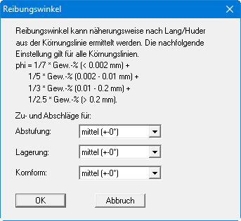 Möchten Sie eine Abschätzung des Reibungswinkels durch das Programm vornehmen lassen, können Sie hier zu berücksichtigende Zu- und Abschläge vorgeben: