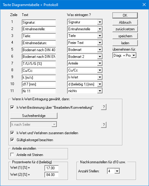 Sie können in der obigen Liste die Darstellung der Durchgänge d10, d30, d50 und d60 auswählen. Zusätzlich haben Sie die Möglichkeit, die Durchgänge zweier beliebiger Prozentwerte darstellen zu lassen. Dazu wählen Sie in der Textzuordnung "d (beliebig 1) [mm]" (siehe Zeile 10 in der obigen Dialogbox) und tragen ganz unten den gewünschten Prozentwert ein. Die Textvorgabe auf der linken Seite passen Sie entsprechend an. Für die Darstellung der Durchgänge können Sie die Anzahl der Nachkommastellen auswählen.