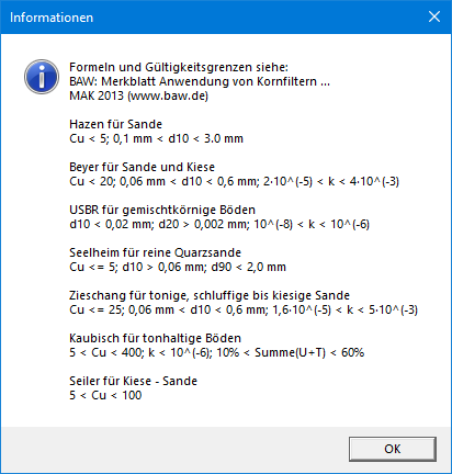Die Ermittlung des k-Wertes erfolgt gemäß Merkblatt Anwendung von Kornfiltern an Bundeswasserstraßen (MAK) der Bundesanstalt für Wasserbau (BAW) in Karlsruhe (2013). Wenn Sie in der Diagrammtabelle den k-Wert darstellen möchten, können Sie im folgenden Bereich eines der verschiedenen Bestimmungsverfahren für alle Kornverteilungen auswählen. Standardmäßig ist jedoch der Schalter "k-Wert-Bestimmung über "Bearbeiten/ Kornverteilung"" aktiviert. Sie können dann im Editor der jeweiligen Kornverteilung unterschiedliche Verfahren auswählen oder bei dortiger Einstellung "Automatisch" das passende Verfahren suchen lassen. Die Suchreihenfolge können Sie nach Klicken auf den entsprechenden Knopf ändern.