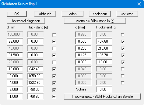 Bei einer neuen Kornverteilung sind zunächst alle Siebe aktiviert, d.h. alle Häkchen in der dritten Spalte sind gesetzt. Passen Sie die vorgegebenen Siebdurchmesser in der Spalte "d [mm]" den tatsächlich verwendeten Siebdurchmessern an. Siebe, die nicht eingesetzt wurden bzw. auf denen kein Rückstand liegen geblieben ist, entfernen Sie durch Ausschalten des Häkchens aus dem Siebsatz.
