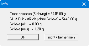Nach Anpassung der Siebdurchmesser geben Sie die Siebrückstände auf den einzelnen Sieben gemäß den vorliegenden Versuchsdaten ein. Zur Berechnung des Rückstands in der Schale kann der Knopf "(Trockengew. - SUM Rückstd.) als Schale" gewählt werden. Folgende Box wird angezeigt: