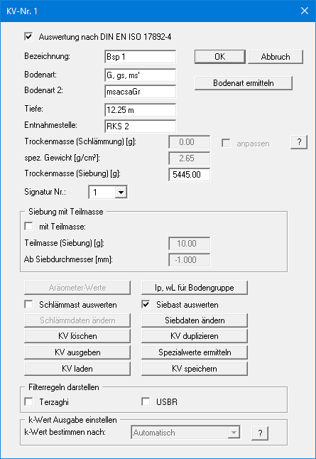 Wenn Sie diesen Knopf anwählen, gelangen Sie in die folgende Dialogbox, die Ihnen die Eingabe der Versuchsdaten einer Siebung ermöglicht: