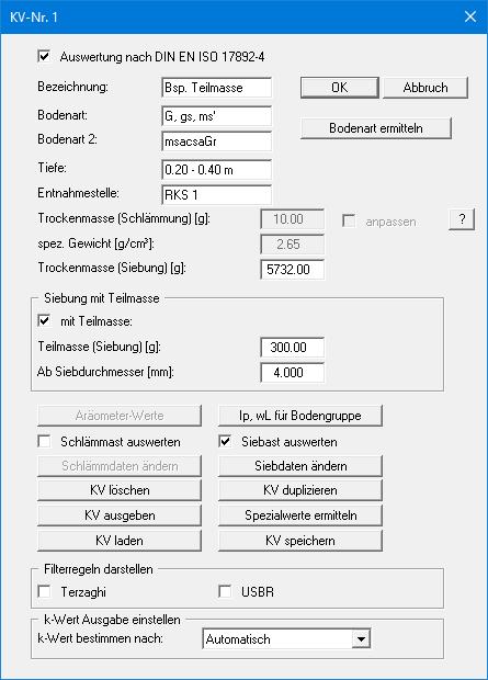 Aktivieren Sie den Schalter "mit Teilmasse" und geben Sie im Eingabefeld darunter die eingesetzte Teilmenge in [g] an, im obigen Beispiel 300 g. Im darunter liegenden Eingabefeld geben Sie den Siebdurchmesser an, ab dem Sie mit der Teilmenge gesiebt haben, entsprechend dem obigen Beispiel ab Siebdurchmesser 4 mm.