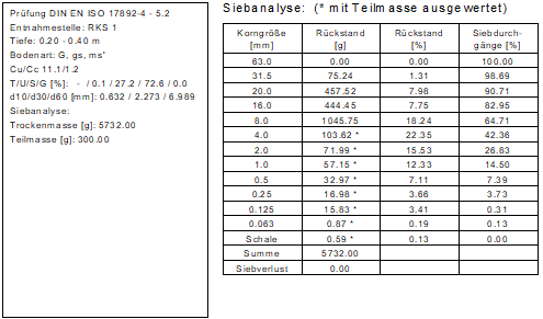 Wenn Sie zu Ihrer grafischen Darstellung der Körnungslinie auch die Ausgabe der Protokollblätter wünschen, sind die Rückstände, die über die Teilsummenwägung ermittelt wurden, in der Tabelle mit einem Stern "* " markiert.