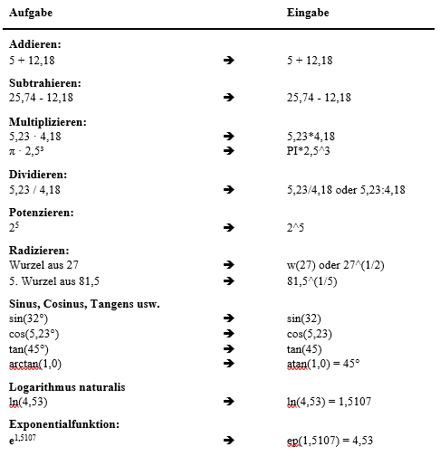 In Eingabeboxen für Zahlenwerte können Sie die nachfolgenden Rechenoperationen, auch in Kombinationen, benutzen, um den gewünschten Wert zu ermitteln oder den vorhandenen Wert anzupassen. Nach Drücken der [Return]- oder [Enter]-Taste wird der ermittelte Wert eingefügt.