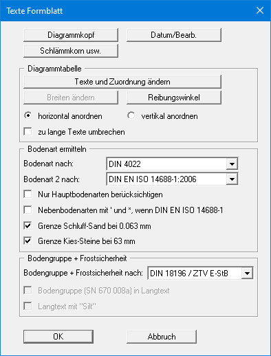 Mit dem Knopf "zurücksetzen" in den Dialogboxen "Diagrammkopf", "Datum/Bearb." und "Schlämmkorn usw." erhalten Sie die Texte oder Zuordnungen, die vom Programm vorgegeben werden. Wenn Sie nachträglich die Sprache auf Englisch umgestellt haben, erhalten Sie damit die programminternen Übersetzungen.