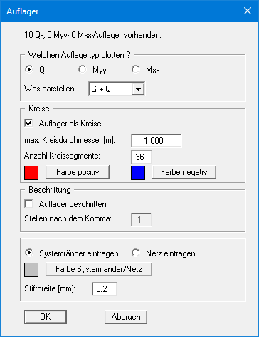 Mit diesem Menüeintrag können Sie eine Kreisgrafik der Auflagerkräfte erzeugen. Die vorhandenen Auflager werden ganz oben in der Dialogbox aufgeführt.