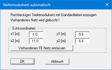 Wenn Sie diesen Menüeintrag anwählen, können Sie ein rechteckiges Steifemodulnetz mit Standardtiefen erzeugen. Sie müssen nur noch die Eckkoordinaten eingeben.