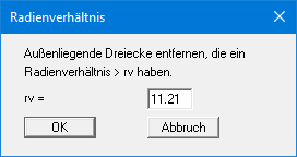 Das Radienverhältnis beschreibt das Verhältnis zwischen Außenradius und Innenradius eines Dreiecks. Bei einem gleichseitigen Dreieck ist dieses Verhältnis gleich 2.0 (Optimum). Bevor Sie die obige Dialogbox erhalten, erhalten Sie das maximale und das mittlere Radienverhältnis im FE-Netz angezeigt. Bei der obigen Vorgabe würden alle außen liegende Dreiecke entfernt, die ein Radienverhältnis größer als 11.21 besitzen. Um ein Chaos zu vermeiden, werden nur außen liegende Dreiecke gelöscht.