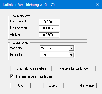 Über die Knöpfe "Strichelung einstellen" und "weitere Einstellungen" können Sie für die Isolinien Festlegungen zur Art der Darstellung treffen. Die Darstellung kann durch Aktivieren des entsprechenden Knopfes mit den Materialfarben der Platte hinterlegt werden.