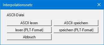 Wenn Sie das im PLT-Format erledigen, werden die Informationen hinsichtlich der Dreiecke und der Bettungsmodule mit abgespeichert oder gelesen. Bei "ASCII lesen" erscheint die Dialogbox wie in Abschnitt Menüeintrag "ASCII-Datei lesen" beschrieben.