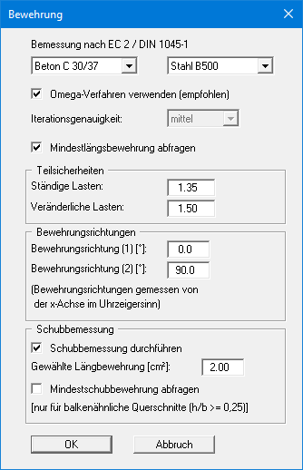 Bevor Sie eine Bewehrung der Platte anschließen können, muss Ihr System berechnet sein. Nach erfolgter Berechnung können Sie in einer Dialogbox zunächst auswählen, ob die Stahlbeton-Bemessung mit dem alten Globalsicherheitskonzept der DIN 1045 oder dem neuen Teilsicherheitskonzept nach EC 2 / DIN 1045-1 durchgeführt werden soll. Vorgegeben ist immer das Sicherheitskonzept, dass Sie unter "Datei / Neu" gewählt haben. Wenn Sie hier das Sicherheitskonzept wechseln, erfolgt die Anpassung auch für die Berechnung. Sie erhalten beim Teilsicherheitskonzept die folgende Dialogbox: