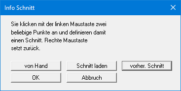 Die Schnittführung ist bei dieser Auswerteform nicht mehr an den FE-Knoten gebunden, sondern besteht aus Anfangs- und Endpunkt. Mit dem Knopf "von Hand" können Sie den Anfangs- und Endpunkt auch über Zahlenwerte festlegen, ohne die Maus zu benutzen. Falls Sie vorher einen Schnitt abgespeichert haben, können Sie ihn mit "Schnitt laden" wieder aufrufen. Der Knopf "vorher. Schnitt" ist nur vorhanden, wenn bereits ein Schnitt definiert worden ist, und ruft den direkt davor festgelegten Schnitt wieder auf.