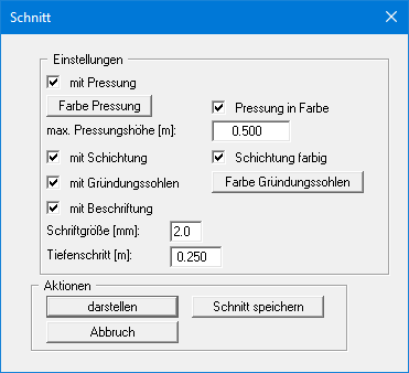 Sie können unterschiedliche Einstellungen für die Darstellung der Spannungen auswählen. Nach Verlassen der Dialogbox über den Knopf "darstellen" berechnet das Programm zunächst die Spannungen und stellt anschließend die Spannungsverteilung über die Tiefe an den festgelegten Aufpunkten in Ihrem Schnitt dar. In der obigen Dialogbox ist es ebenfalls möglich, den festgelegten Schnitt zu speichern.