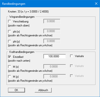 Klicken Sie die Knoten mit den beiden oben angegebenen Koordinaten an (Knoten 33 und Knoten 73) und geben jeweils Folgendes ein: