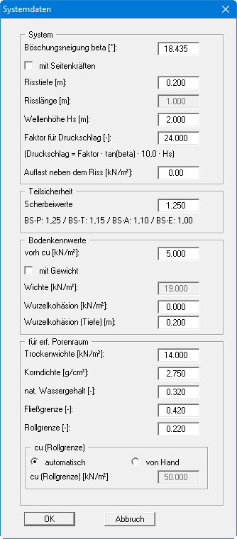 Wenn Sie unter "Bearbeiten / System einstellen" eine Druckschlagberechnung gewählt haben, erhalten Sie die folgende Dialogbox zur Eingabe der maßgeblichen Kenndaten des Systems: