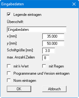 Wenn Sie den Schalter "Legende eintragen" in der Dialogbox dieses Menüeintrages aktivieren, werden die Daten, die Sie zur Berechnung eingegeben haben, in einer Legende dargestellt.