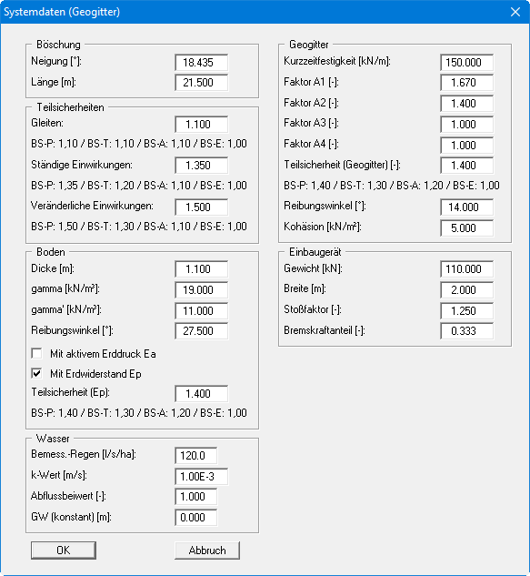 In den jeweiligen Bereichen geben Sie die maßgeblichen Kennwerte für Böschung, Boden, Wasser, Geogitter und Einbaugerät vor. Bei gewähltem Teilsicherheitskonzept können Sie in der Dialogbox zusätzlich die jeweiligen Teilsicherheiten eingeben.