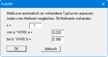 Bei Anwahl des Menüeintrages "Typkurven / autofit 1" vergleicht das Programm die Messdaten automatisch mit den vorhandenen Typkurven und sucht nach der Methode der kleinsten Fehlerquadrate die am besten passende Typkurve aus.
