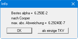 Nach dem Abschluss der Berechnung öffnet sich ein Fenster, in dem der gewählte Typkurvenparameter zu Ihrem Auswertemodell angezeigt wird. Dazu wird die maximale absolute Abweichung zwischen der Mess- und der Typkurve berechnet. Wenn Sie das Fenster mit "OK" verlassen, wird der Typkurvenfit auf dem Arbeitsblatt sichtbar.