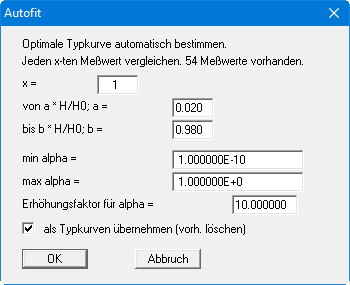 Bei diesem fit-Verfahren wird nicht die am besten passende Typkurve aus einem bestehenden Satz von Typkurven ermittelt, sondern es wird die optimale Typkurve berechnet. Dies bedeutet, dass das Programm durch systematische Variation des Typkurvenparameters die optimal passende Typkurve erzeugt. Haben Sie sich für "autofit 2" entschieden, so erscheint die folgende Dialogbox: