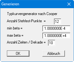 Haben Sie alle Einstellungen getätigt und die Eingaben mit "OK" abgeschlossen, öffnet sich eine weitere Dialogbox mit der Überschrift "Typkurvengenerator nach Cooper" (der Name entspricht dem von Ihnen gewählten Auswertemodell).