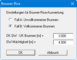 Sie können zwischen einem unvollkommenen Brunnen (Fall A) und einem vollkommenen Brunnen (Fall B) wählen. Das BOUWER & RICE - Auswertemodell kann sowohl bei einem freien als auch (halb-) gespannten Aquifer angewendet werden.