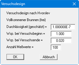 Nach der Wahl dieses Punktes öffnet sich eine Dialogbox "Versuchsdesign nach Hvorslev". Es erscheint diejenige Konfiguration (Fall A/B), die Sie zuvor unter dem Menüeintrag "Hvorslev, ... / - einstellen" gewählt haben.