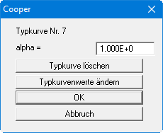 Auf diese Weise können Sie neue Typkurven, die Sie aus einer Publikation abgetippt oder sich auf andere Weise besorgt haben, einfügen. Wenn Sie "neue" gewählt hatten, aber die Box mit "Abbruch" verlassen, werden alle evtl. getätigten Eingaben nicht übernommen, die Typkurve ist als solche aber vorhanden (neuer Knopf mit alpha-Wert als Beschriftung). Das Löschen einzelner Kurven erreichen Sie über den Knopf "Typkurve löschen".