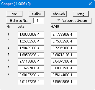 Bei einer neuen Typkurve sind noch keine Aufpunkte vorhanden. Klicken Sie dann als erstes auf den Knopf "0 Aufpunkte ändern" (im obigen Beispiel sind bereits 71 Aufpunkte vorhanden) und geben Sie die gewünschte Anzahl vor. Mit den Knöpfen "vor" und "zurück" blättern Sie in der Liste der Aufpunkte oder Sie springen nach Eingabe der gewünschten Nummer und Klicken auf "Gehe zu Nr.:" direkt dorthin. Nach Abschluss der Eingabe oder Änderungen klicken Sie auf "fertig".