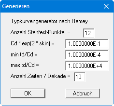Das Generieren von Typkurven nach dem Auswertemodell von RAMEY erfolgt prinzipiell genau wie beim Modell COOPER. Abweichend davon wird bei RAMEY als Typkurvenparameter CD e2seingegeben.