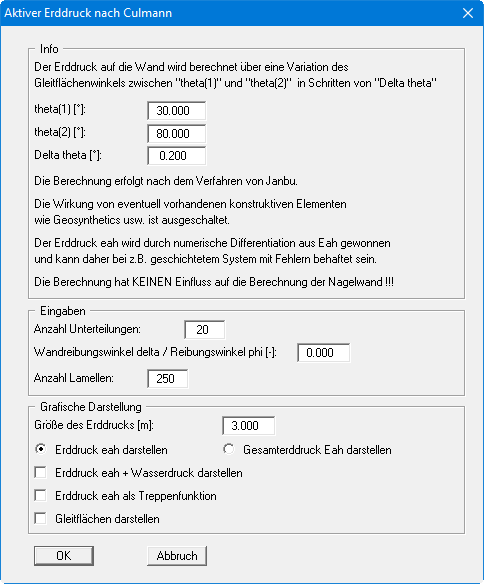 Über diesen Menüeintrag können Sie den aktiven Erddruck nach Culmann bestimmen lassen. Sie erhalten die folgende Dialogbox: